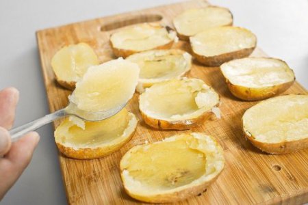 - Шаг 4 Достаем из духовки картофель, охлаждаем. Острым ножиком разрезаем картофель вдоль пополам, потом аккуратненько, стараясь не разрушить кожуру, ложкой достаем мякоть и перекладываем в крупную тарелку.