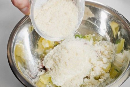 - Шаг 5 Прибавляем в тарелку очищенный от шкурки печеный чеснок, сметану, мало оливкового масла, рубленую зелень, обжаренный бекон, тертый сыр и аккуратненько помешиваем, стараясь не перевоплотить консистенция в пюре. Мало тертого сыра сохраняем для обсыпки.