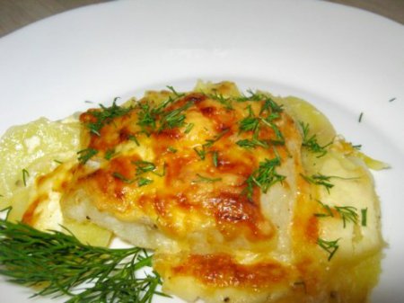 - Шаг 7 Готовую рыбу с картофелем выкладываем на тарелку, посыпаем зеленью и подаем к столу.