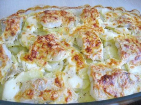 - Шаг 2 Картофель режем мелкими кружочками, выкладываем в форму, смазанную маслом , солим, перчим.