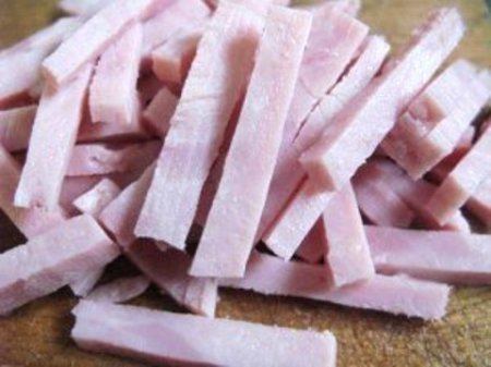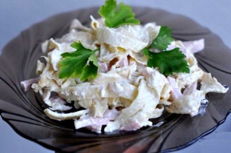 - Шаг 5 Путаем яичные блины и ветчину, набавляем пропущенный сквозь пресс чеснок, заправляем майонезом, солим, перчим, размешиваем и подаем к столу.