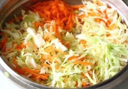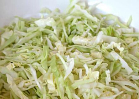 - Шаг 1 Капусту мелко шинкуем, слегка солим и мнем руками.