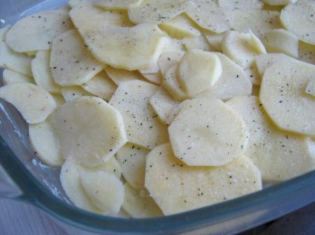 - Шаг 2 Картофель режем высокими кружочками, выкладываем в форму, смазанную маслом , солим, перчим.