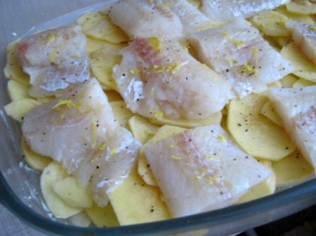 - Шаг 3 На картофель выкладываем куски рыбы. Каждый кусок посыпаем лимонной цедрой и сбрызгиваем лимонным соком.
