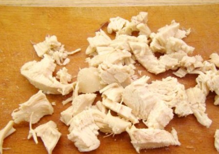 • Шаг 2 Куриное филе отвариваем до готовности, охлаждаем , режем маленькими кубиками.