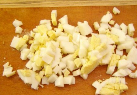 • Шаг 4 Яичка варим, охлаждаем, режем кубиками.