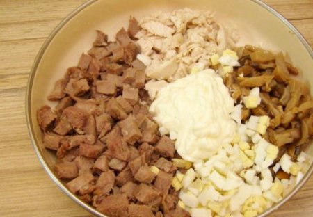 • Шаг 5 В глубокую тарелку выкладываем язык, куриное филе, яичка, грибы. Заправляем майонезом, солим и отлично помешиваем.