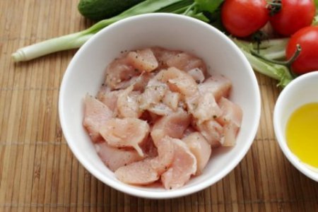 • Шаг 1 Куриное филе режем малолетними кусками , солим, перчим, набавляем специи. Ладно размешиваем и сохраняем минут на 5-10.