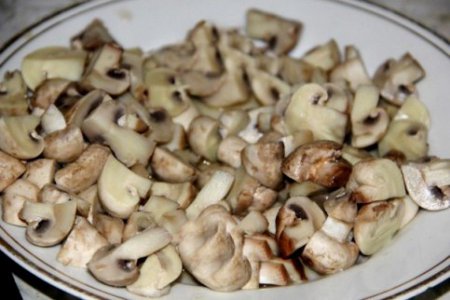 • Шаг 2 Грибы ладно промываем, кладем в кастрюлю, заливаем водой, ставим на огонь и варим до готовности минут 8-10. Охлаждаем и разрезаем на четыре количества.