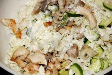 • Шаг 5 Мешаем капусту, куриное филе, огурцы, грибы. Заправляем майонезом, размешиваем.