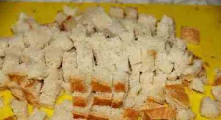 • Шаг 6 Хлеб нарезаем незначительными кубиками и обжариваем на бездушный сковороде до золотистого цвета.