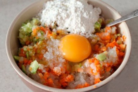 - Шаг 2 Кабачок и морковь пропускаем спустя мясорубку, прибавляем к рыбе с луком. Затем измельчения кабачок приносит сок, тот или другой необходимо отжать, что бы фарш не был водянистым.