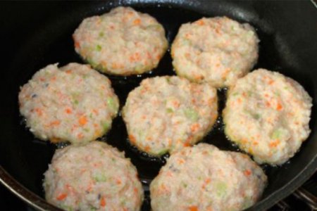 - Шаг 4 Из фарша формируем котлеты и выкладываем на разогретую сковороду с растительным маслом. Обжариваем и перекладываем.