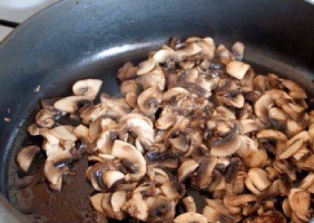 • Шаг 1 Шампиньоны режем пластинами и обжариваем на растительном масле.