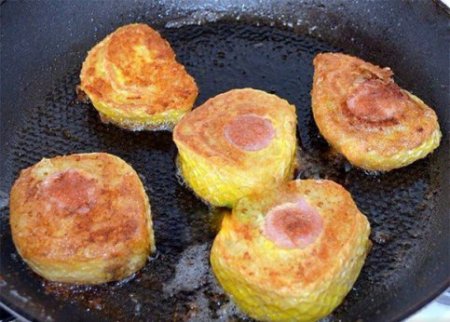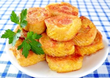 • Шаг 6 Обмакиваем дольки рулета во взбитом с солью яичке и выкладываем на разогретую сковороду с маслом, жарим с 2-ух сторонок до золотистой корочки .
