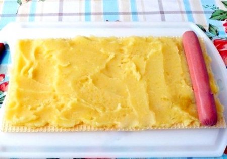 • Шаг 4 Скручиваем вафельный лист с сосиской и пюре в рулет.