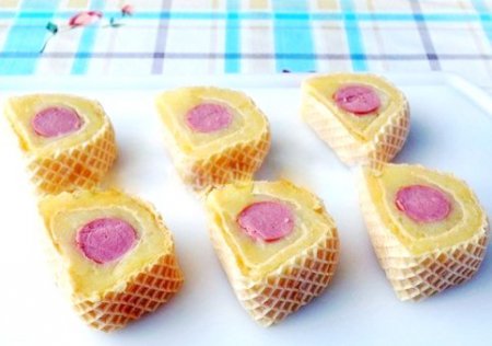 • Шаг 3 Сосиски вычищаем от слюды либо кожуры, выкладываем на закраина вафельного листа.